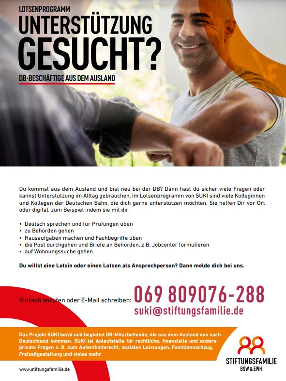 „Soziale und kulturelle Integration“, kurz „SUKI“, begleitet den Onboarding-Prozess von Mitarbeitenden mit Flucht- oder Migrationserfahrung bei der DB. Das Team unterstützt dabei, soziale und kulturelle Hürden zu überwinden und fördert den Zusammenhalt und die Integration innerhalb der DB.